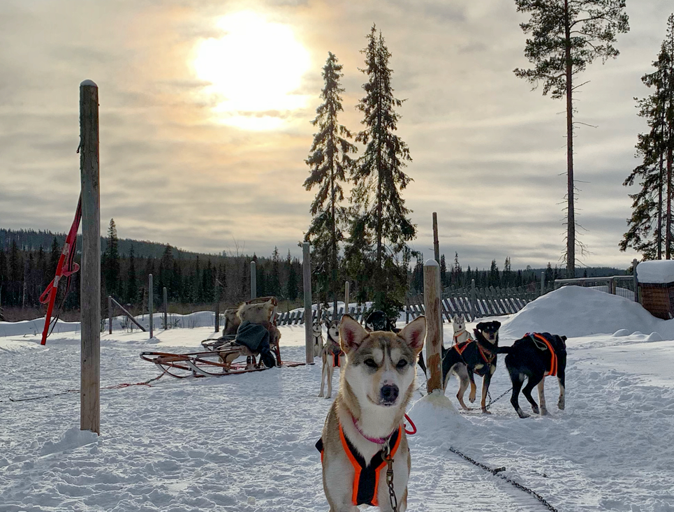Die Hunde begrüßen uns schon mit freudigem Bellen. Das Team vor Ort gibt uns alle wichtigen Informationen zu unserer Hundeschlittentour. Und endlich kann die Fahrt mit unserem Hundegespann beginnen. Wir teilen uns jeweils zu zweit einen Schlitten: Eine Person sitzt im Schlitten und genießt die vorbeiziehende Winterlandschaft, die andere lenkt und bremst das Gespann. Schon bald haben wir ein Gefühl für den Schlitten und können die ca. 25–30 km lange Tour genießen (Fahrertausch unterwegs). Am Ende stärken wir uns gemütlich am Feuer.